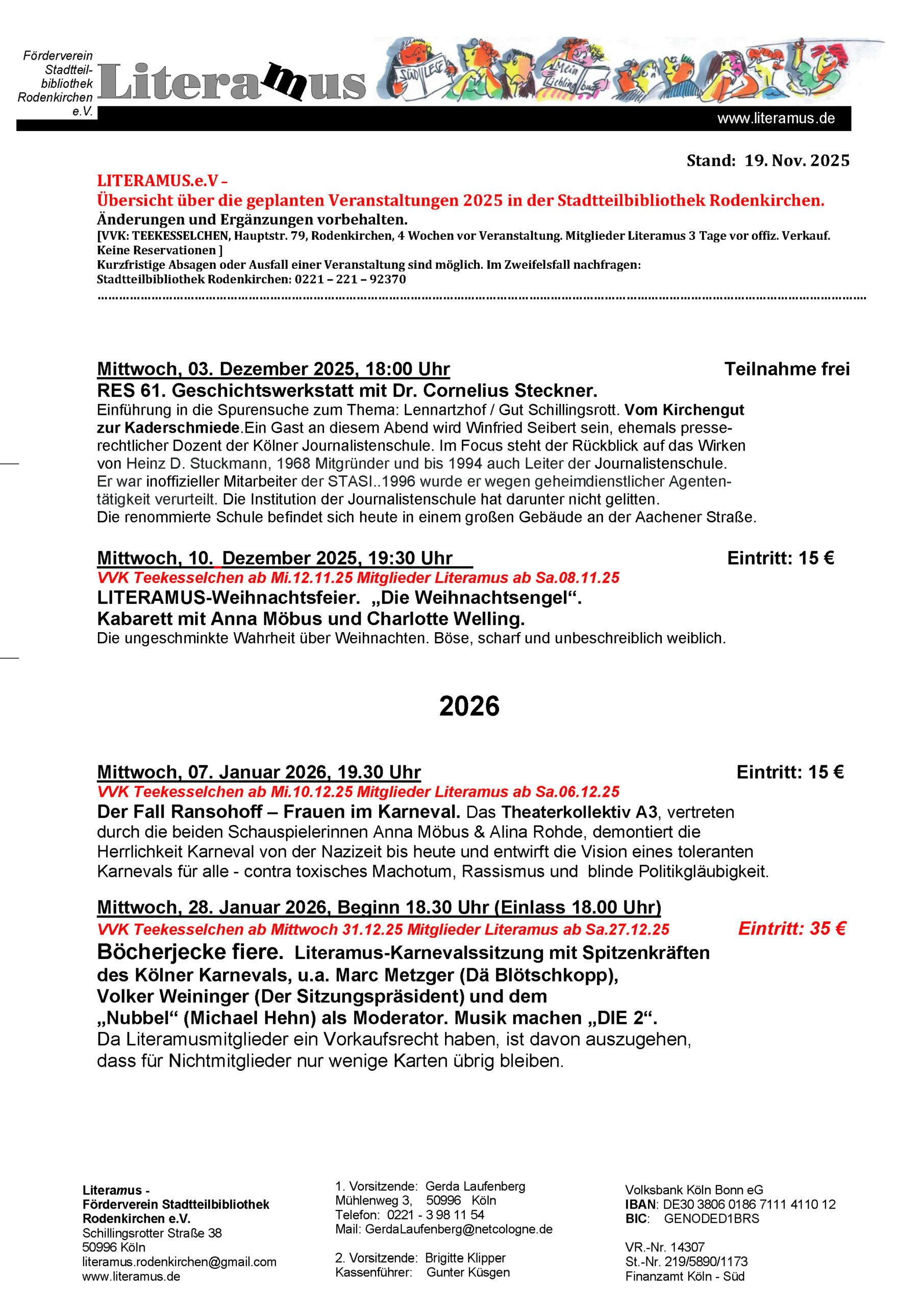 Literamus – Förderverein der Stadtteilbibliothek Rodenkirchen e.V. informiert regelmäßig über anstehende Veranstaltungen und sonstige Entwicklungen.